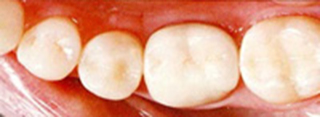 セラミックのみを使用しており、インレー、クラウンに使用されます。天然歯と同程度の硬さを持ち、また見た目にも自然な色調が再現できるため、治療痕が分かりません。治療費用は比較的高額になりますが、患者様の歯の色や形にピッタリの技工物がつくれる優れた素材です。